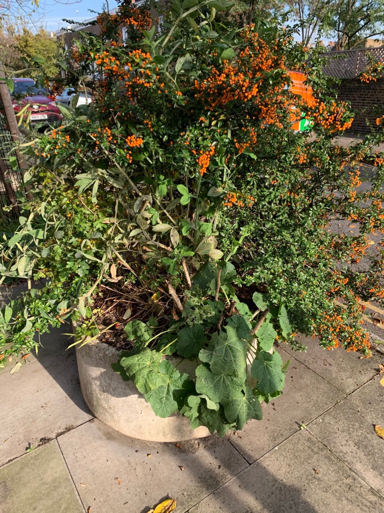 A somewhat macabre question to ask but if you are interested in gardening more sustainably and rewilding your part of the city, through guerrilla gardening in particular, it’s an important question. I’ve been reflecting on it after spotting these autumnal tree pits and street pots on a walk earlier this week. They look magnificent but much less fussed over than those I maintain.A simple first question, for example, is can your planting survive without you watering it (after establishing itself)? It was a crucial factor for my planting in tree pits after a couple of years of pouring precious water into, basically, holes in the pavement. Now I forage plants I’ve seen growing in neglected, and therefore unwatered, tree pits. And mulch.
