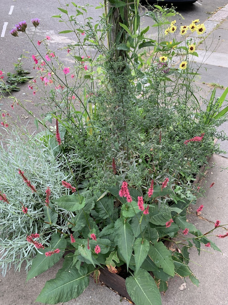 It’s irresistible to pollinators, particularly smaller ones such as hoverflies and scissor bees, so ideal for the guerrilla gardens in the tree pits (below in 2019)