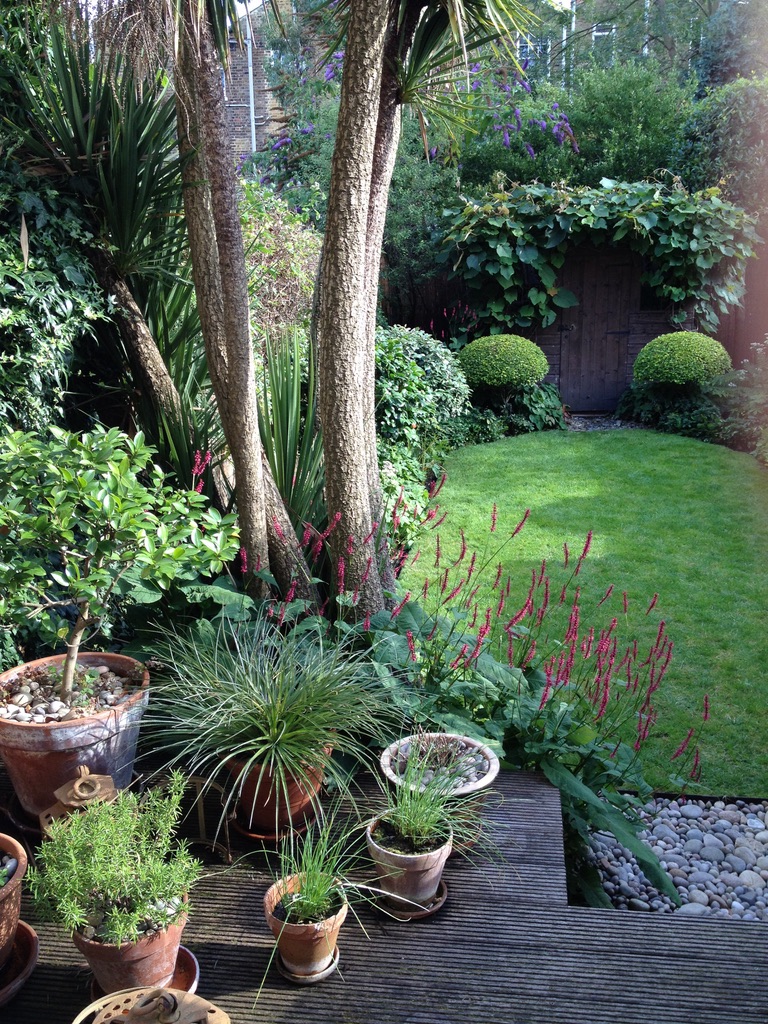 and under the trees in our present London garden (below in 2017).